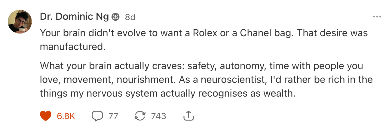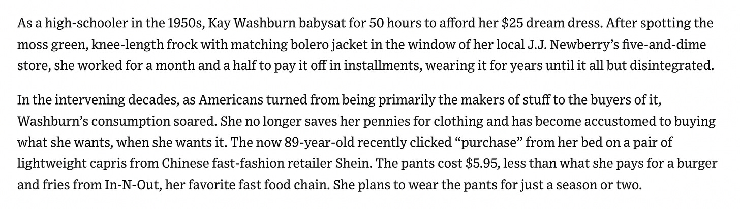 Assigning yourself sociocultural capital and calling it service journalism has metastasized into an economy of its own. Influencers and creators make entire livings off product recommendations, with affiliate-marketing platforms like LTK driving $5B in annual retail sales. Unsustainable, compulsive consumption is the default writ large. I saw a Wall Street Journal article lately about Americans’ appetite for buying cheap stuff. In short, we have never owned more than we do now, and yet so little of it is designed to endure:
